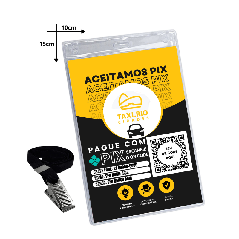 Um lindo Cartão tipo credencial com acesso prático ao seu PIX, personalizado com sua logotipo para facilitar e agilizar suas vendas. Escaneando o QR, impede de qualquer erro de digitação pelo cliente, e todos ganham tempo!