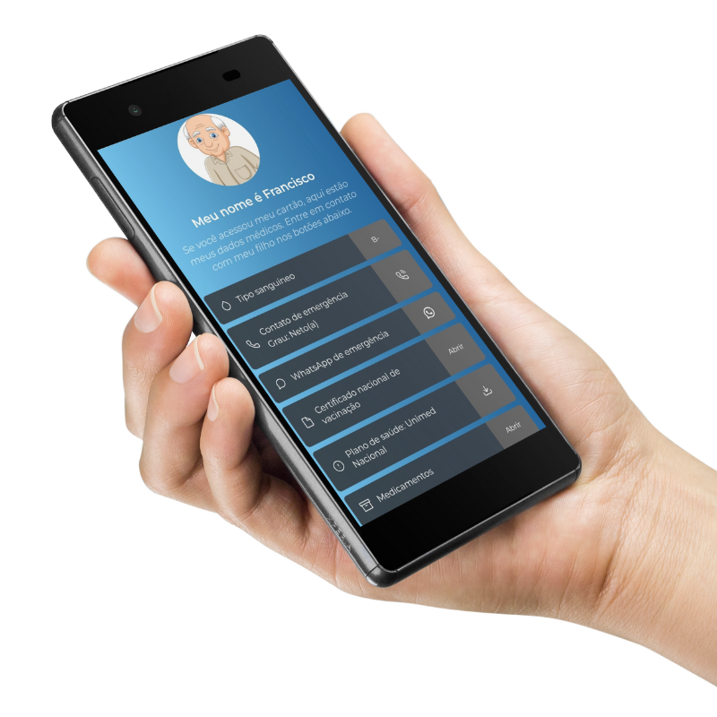 O Perfil Med é um dispositivo que utiliza tecnologia NFC. Quando alguém aproximar o celular do cartão abrirá uma página com as informações cadastradas. Não perca mais tempo, sinta-se seguro, protegendo quem você ama!